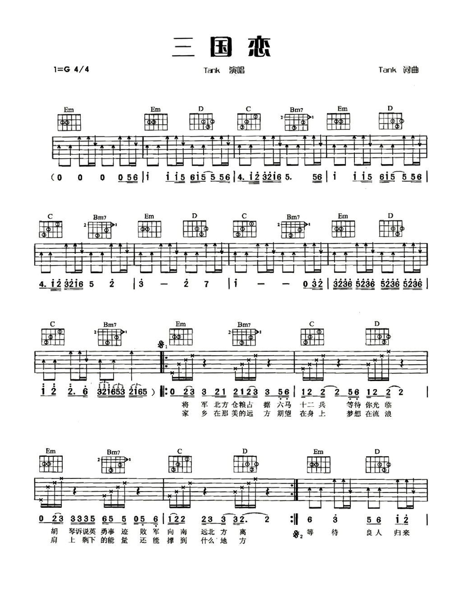 六线谱编配,图片谱扫描版。《三国恋》旋律融合了中国风音乐元素,大气磅礴中带着凄美,唱不尽的江湖风雨儿女情长。tank吕建中的《三国恋》吉他弹唱谱。...