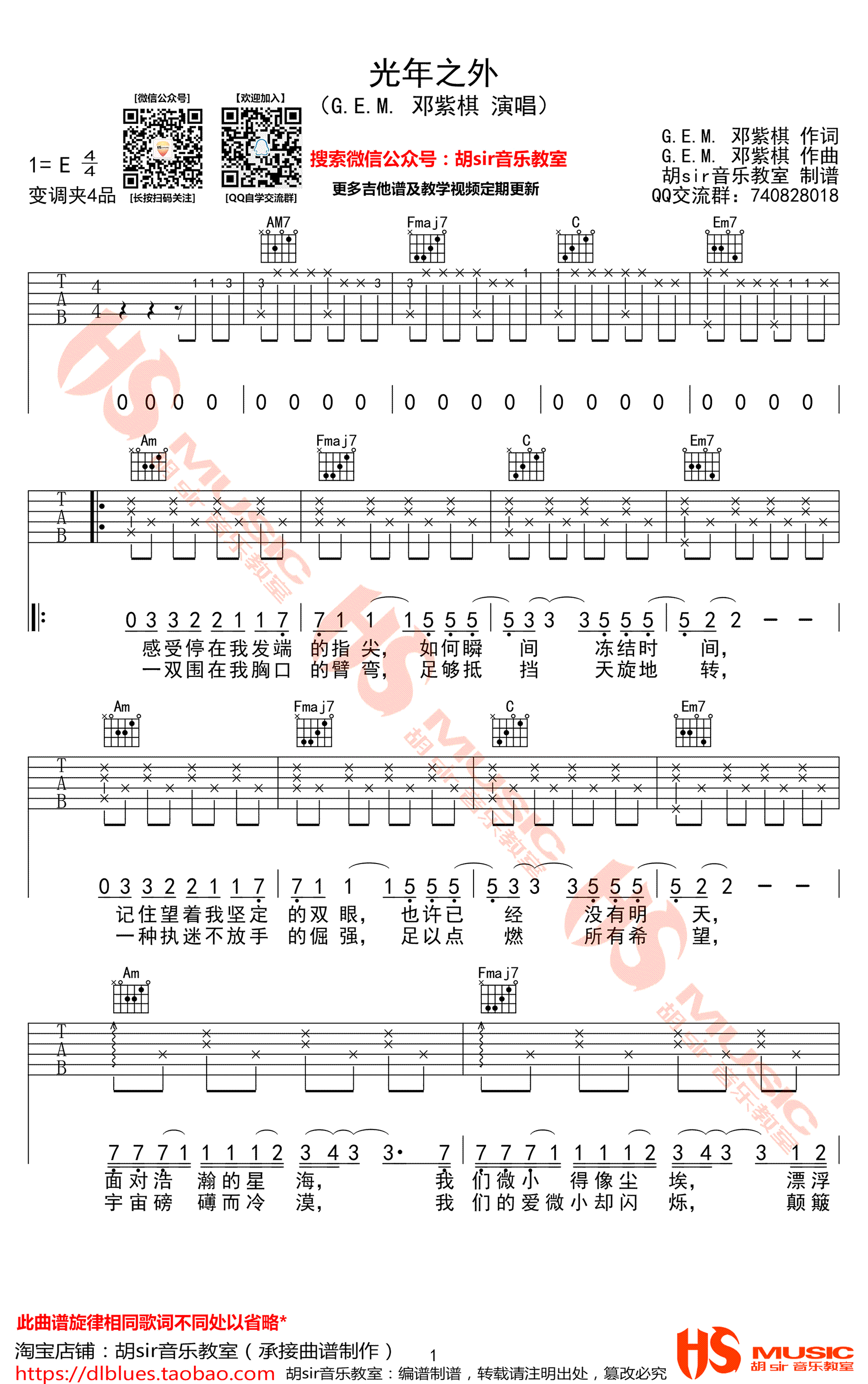 吉他邓紫棋《光年之外》吉他谱_吉他弹唱谱_胡sir编配编配