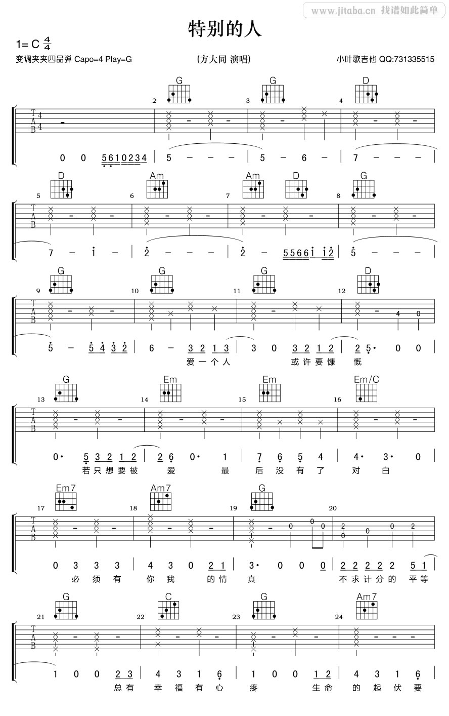 吉他方大同《特别的人》吉他谱_吉他弹唱谱_小叶歌吉他编配