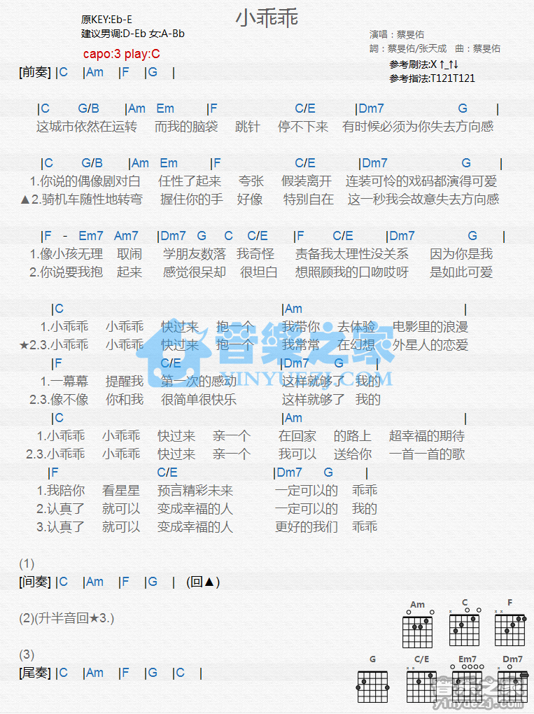 吉他蔡旻佑《小乖乖》吉他谱_吉他弹唱谱_YYZJ编配