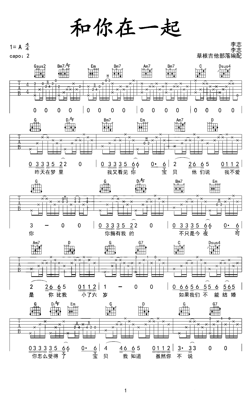 吉他李志《和你在一起》吉他谱_吉他弹唱谱_草根吉他部落编配