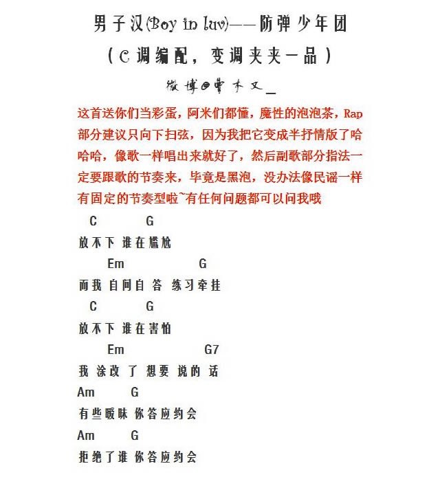 防弹少年团BoyInLuv吉他谱,男子汉吉他弹唱谱,C调编配,和弦谱编配,变调夹夹一品,방탄소년단(防弹少年团)的单曲《상남자(BoyInLuv)(男子汉)中文版。...