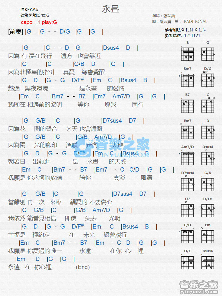 G调版张韶涵《永昼》吉他和弦弹唱谱...