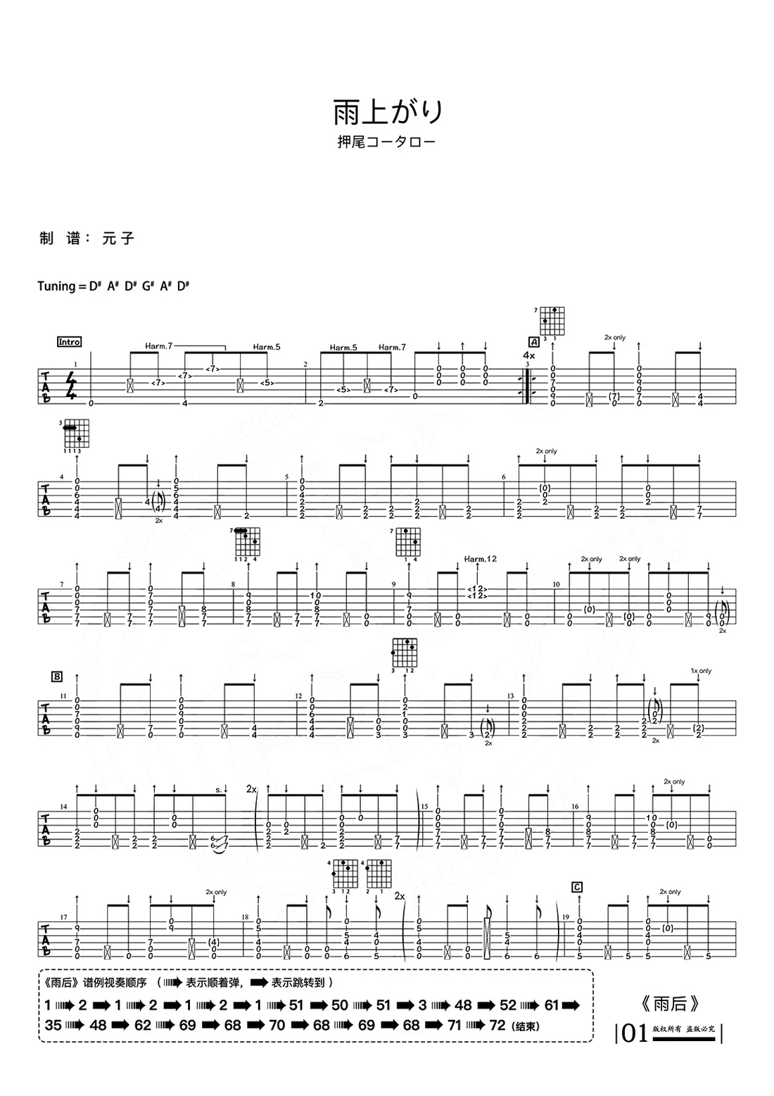吉他押尾《雨后》吉他谱_吉他弹唱谱_元子编配