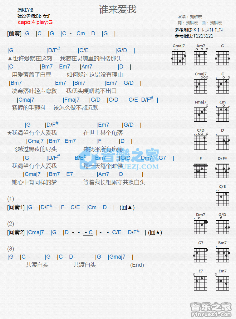 G调版刘耕宏《谁来爱我》吉他和弦弹唱谱...