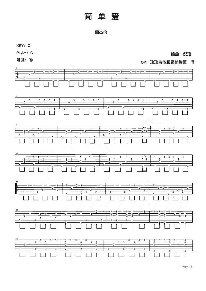 浪漫的爱情是永恒的主题旋律,《简单爱》这首歌是周董早期原创作品,像一个青涩的少年的初恋情怀,曲风轻松自然又带着一丝清新田园气息。周杰伦歌曲指弹吉他谱整理收藏。...
