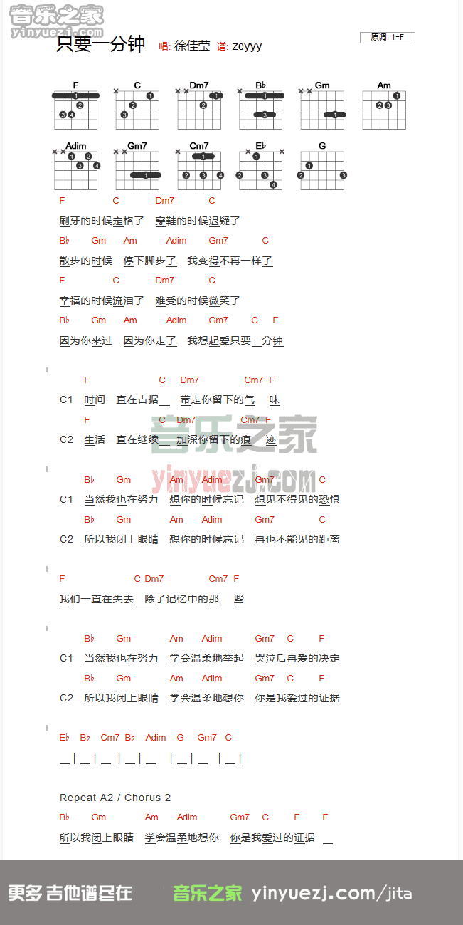 吉他徐佳莹《只要一分钟》吉他谱_吉他弹唱谱_YYZJ编配