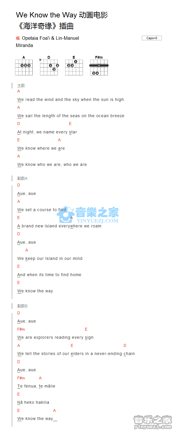 吉他海洋奇缘插曲《We Know The Way》吉他谱_吉他弹唱谱_YYZJ编配