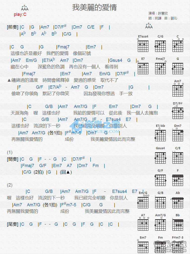 吉他许慧欣《我美丽的爱情吉他和弦弹唱谱》吉他谱_吉他弹唱谱_YYZJ编配