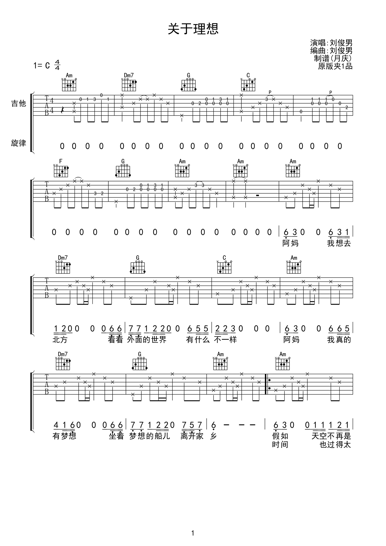 吉他刘俊男《关于理想》吉他谱_吉他弹唱谱_月庆编配