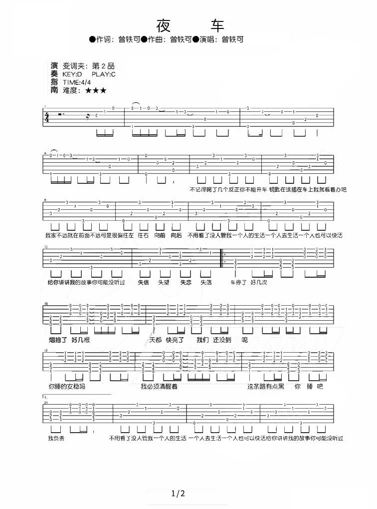 吉他曾轶可《夜车》吉他谱_吉他弹唱谱_余洋编配