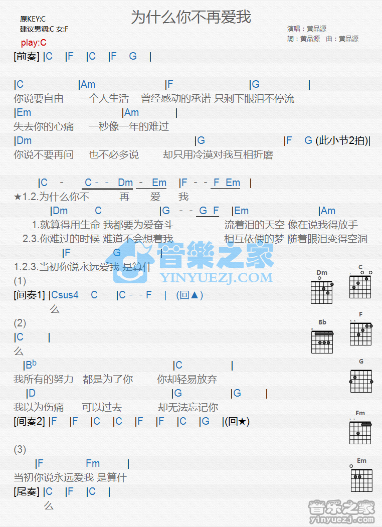 C调版黄品源《为什么你不再爱我》吉他和弦弹唱谱...