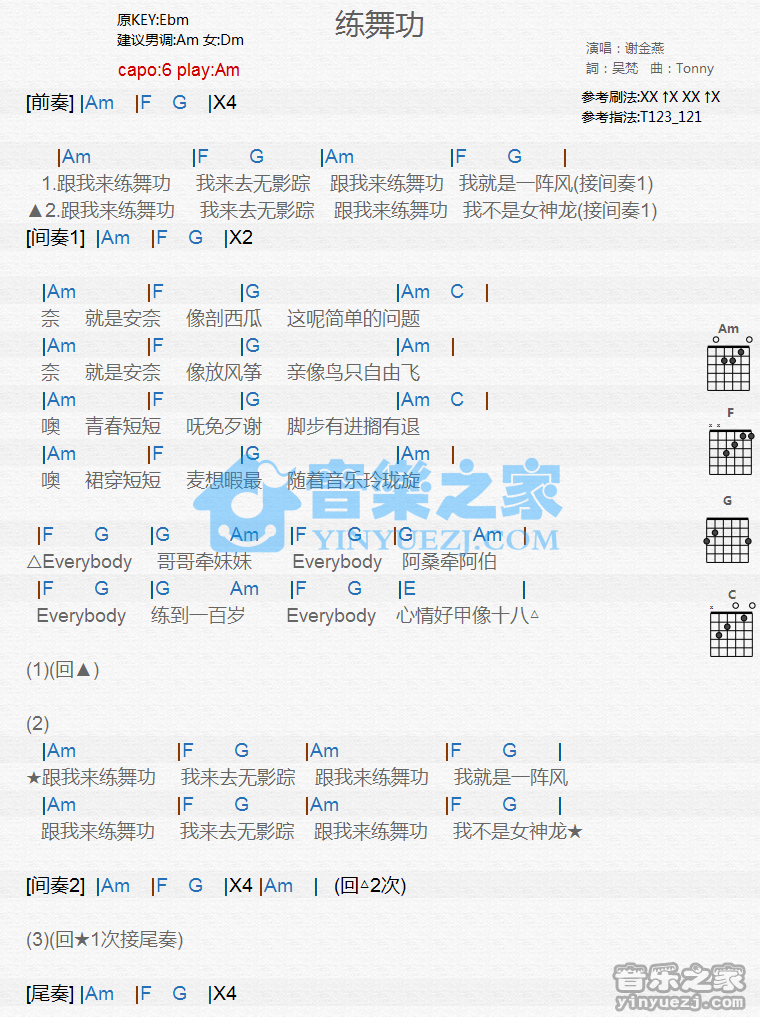 Am调版《练舞功》吉他和弦弹唱谱...