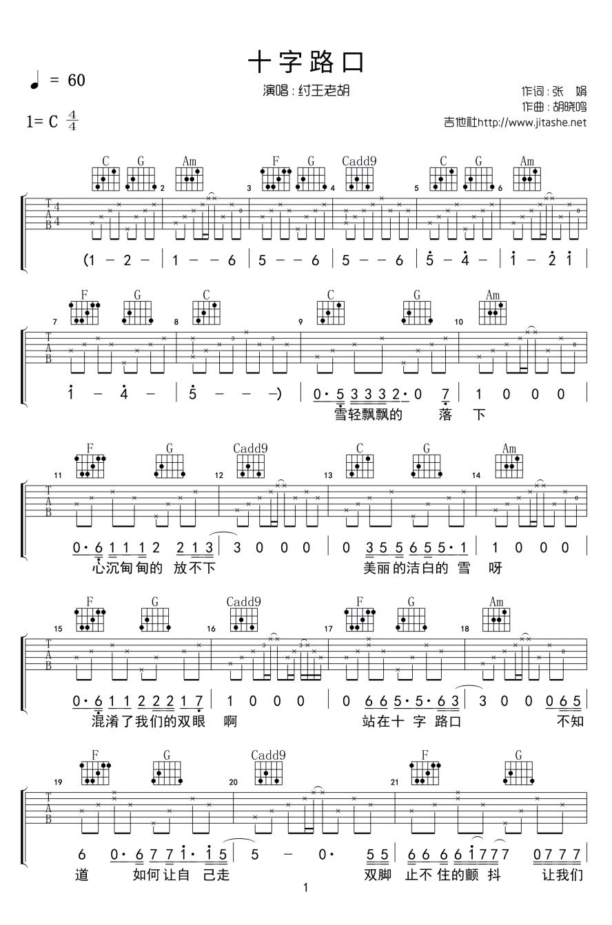 纣王老胡演唱,十字路口吉他谱,C调编配六线谱,我站在十字路口,明明知道那条荒芜的路也许会葬身,却仍然奋力前往。因为我也荒芜,我的枯地只有你能灌溉。每首歌,每个人,都是一个故事。各自曲折,各自悲哀。十字路口吉他弹唱谱,纣王老胡民谣歌曲推荐收藏。...