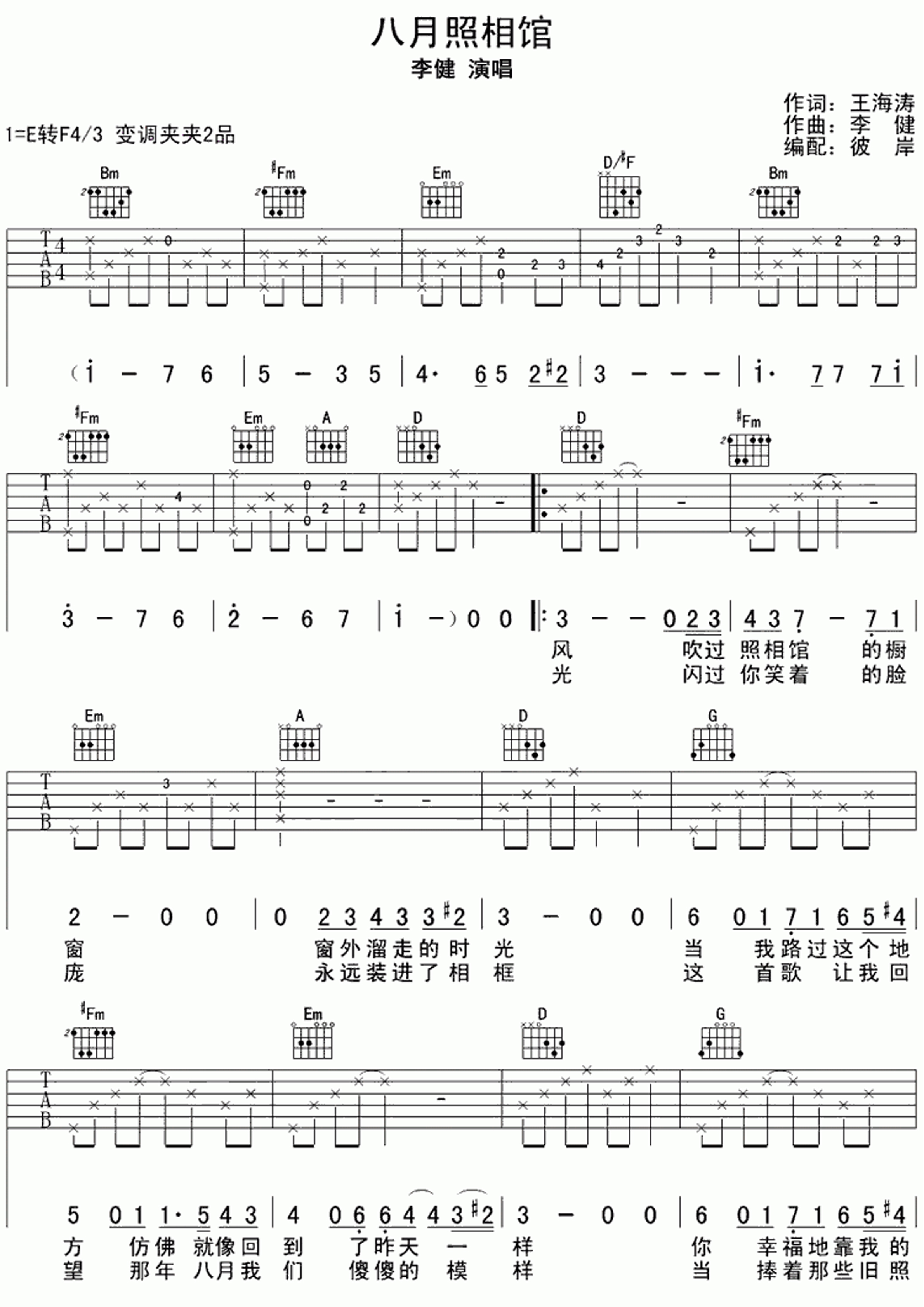 吉他李健《八月照相馆》吉他谱_吉他弹唱谱_彼岸吉他编配