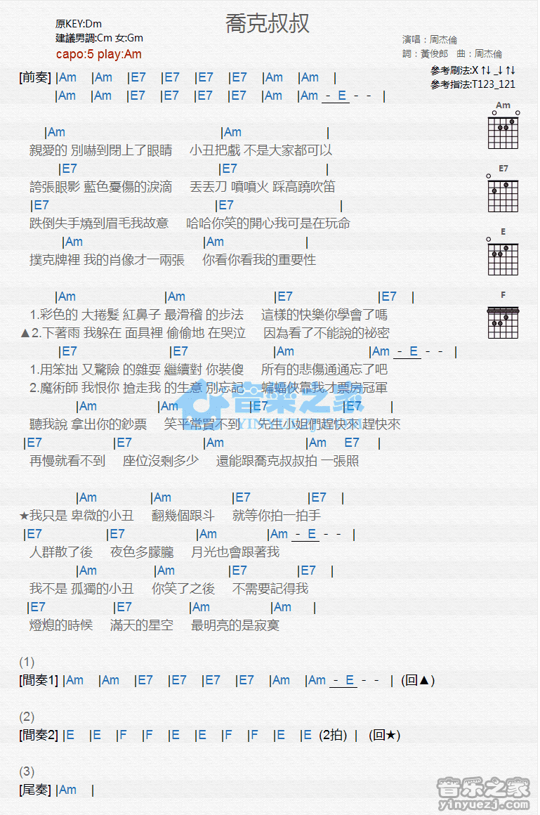 Am调版周杰伦《乔克叔叔》吉他和弦弹唱谱...
