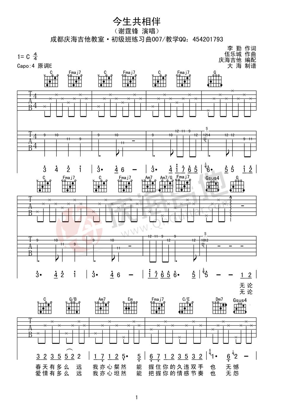 吉他谢霆锋《今生共相伴》吉他谱_吉他弹唱谱_大海编配