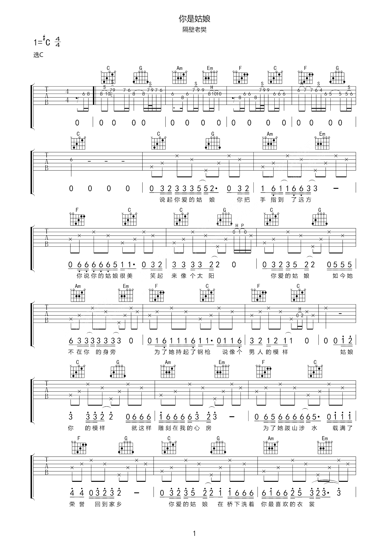 隔壁老樊《你的姑娘》吉他谱_C调吉他弹唱谱...