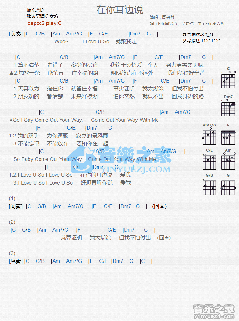 C调版周兴哲《在你耳边说》吉他和弦弹唱谱...
