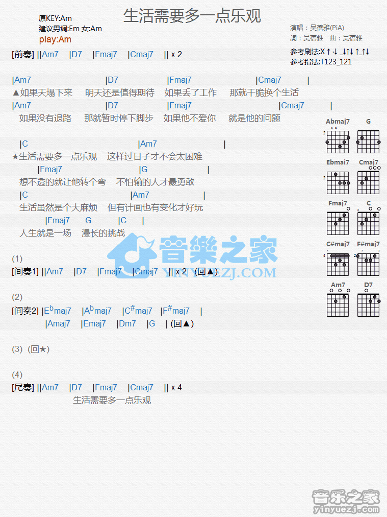 Am调版吴蓓雅《生活需要多一点乐观》吉他和弦弹唱谱...