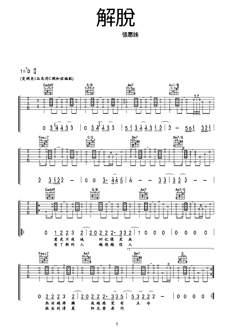 吉他张惠妹《解脱》吉他谱_吉他弹唱谱_玩易午夜编配