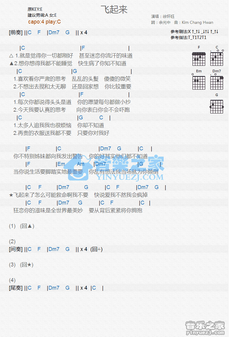 C调版徐怀钰《飞起来》吉他和弦弹唱谱...