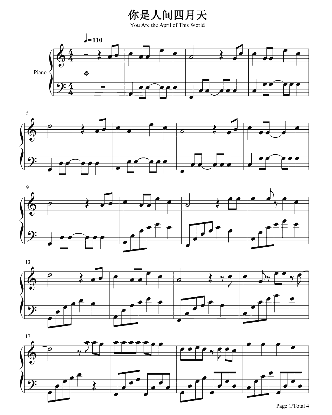 钢琴解忧邵帅《你是人间四月天》钢琴谱