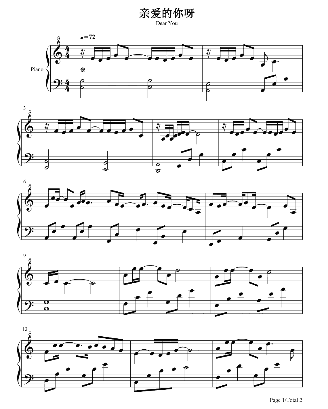 钢琴张远《亲爱的你呀》钢琴谱