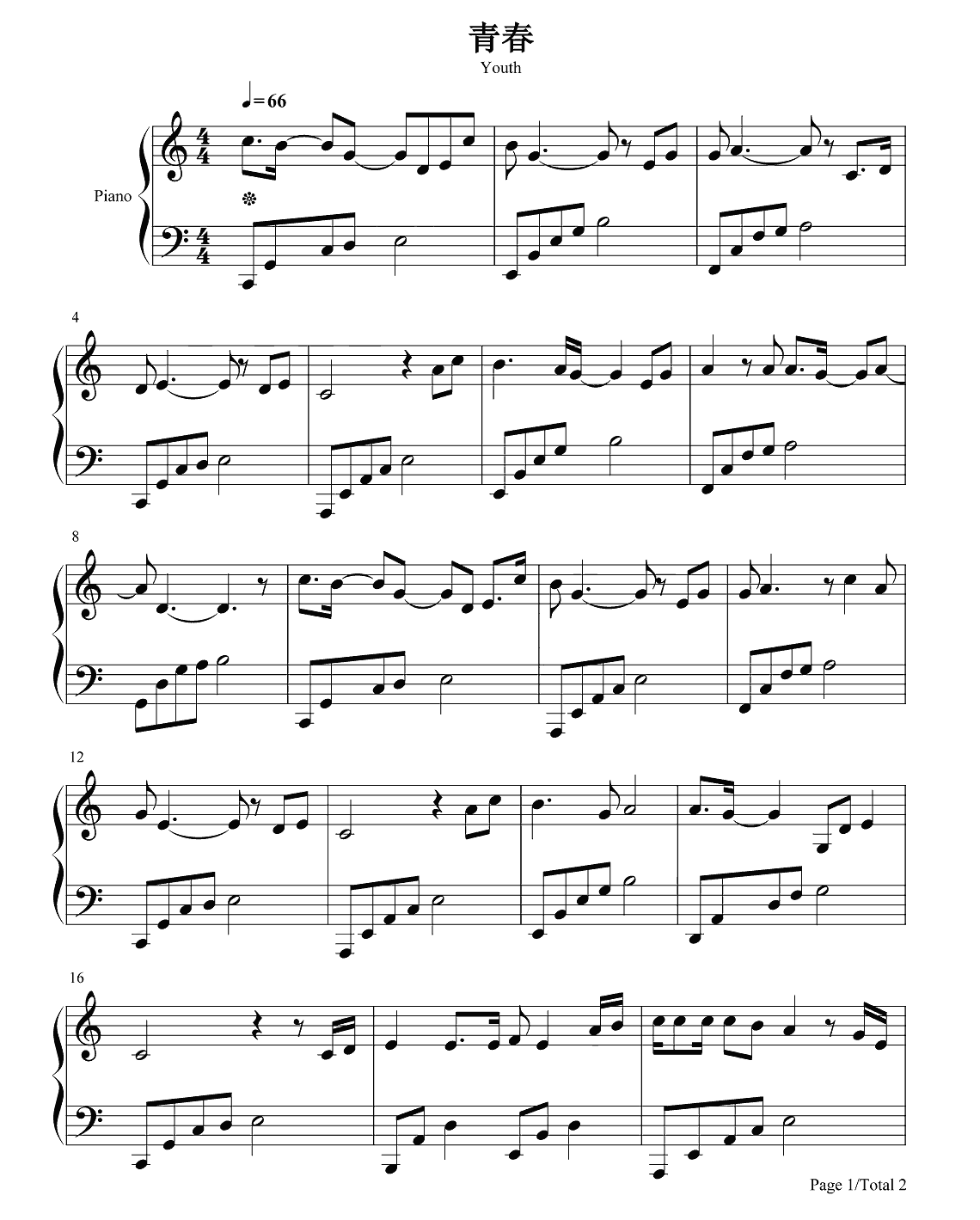 钢琴电影《革命者》推广曲《青春》钢琴谱