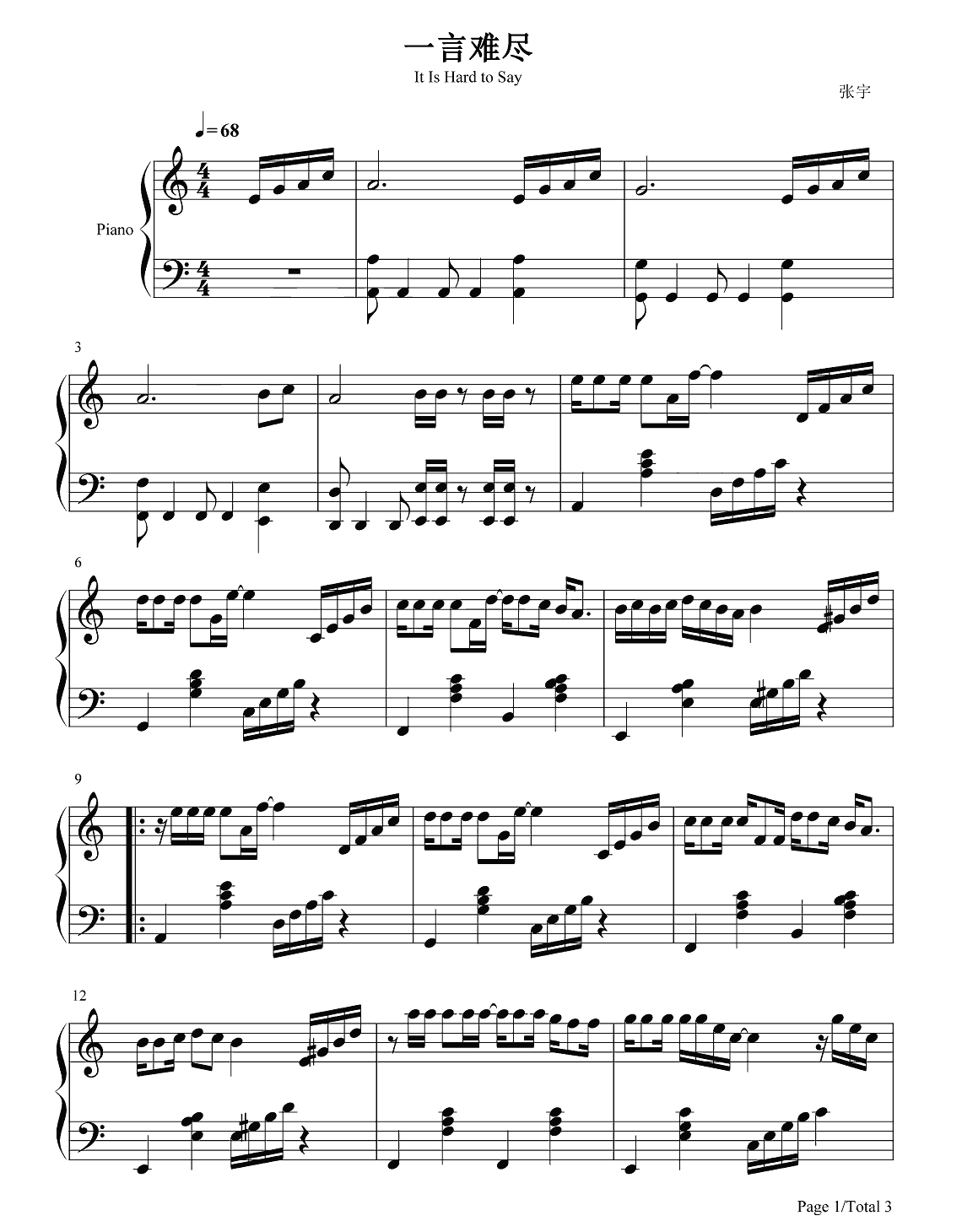 钢琴张宇《一言难尽》钢琴谱 高清版