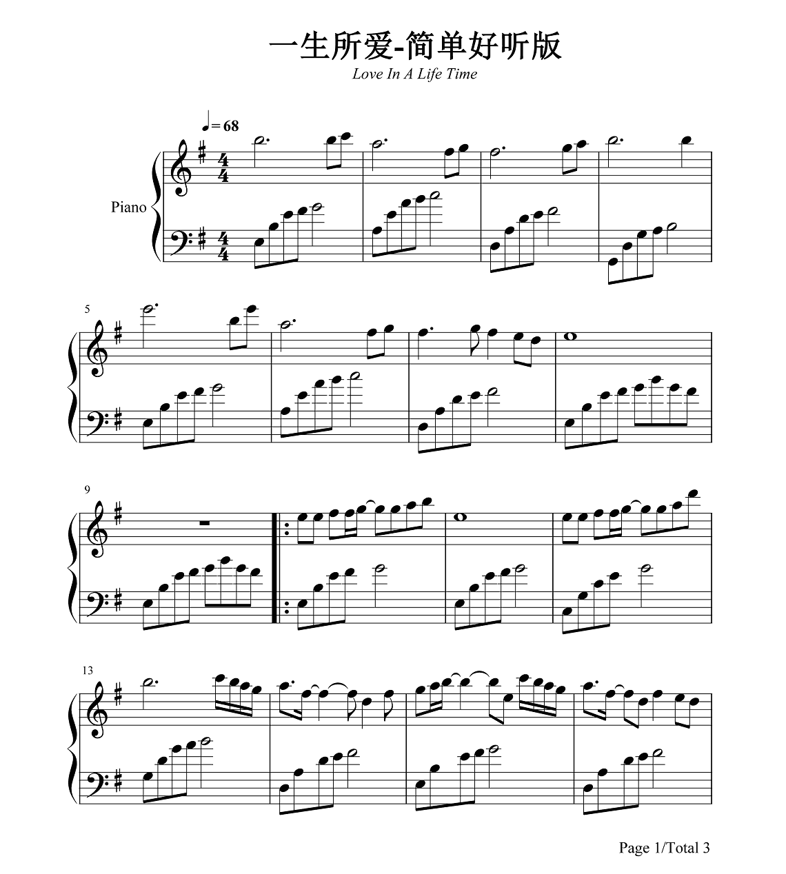 钢琴卢冠廷《一生所爱》钢琴谱 高清版