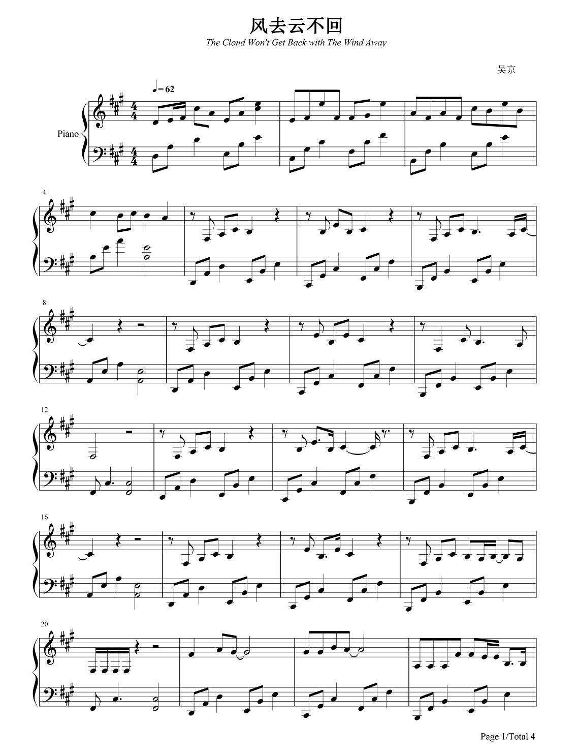 钢琴吴京《风去云不回》钢琴五线谱