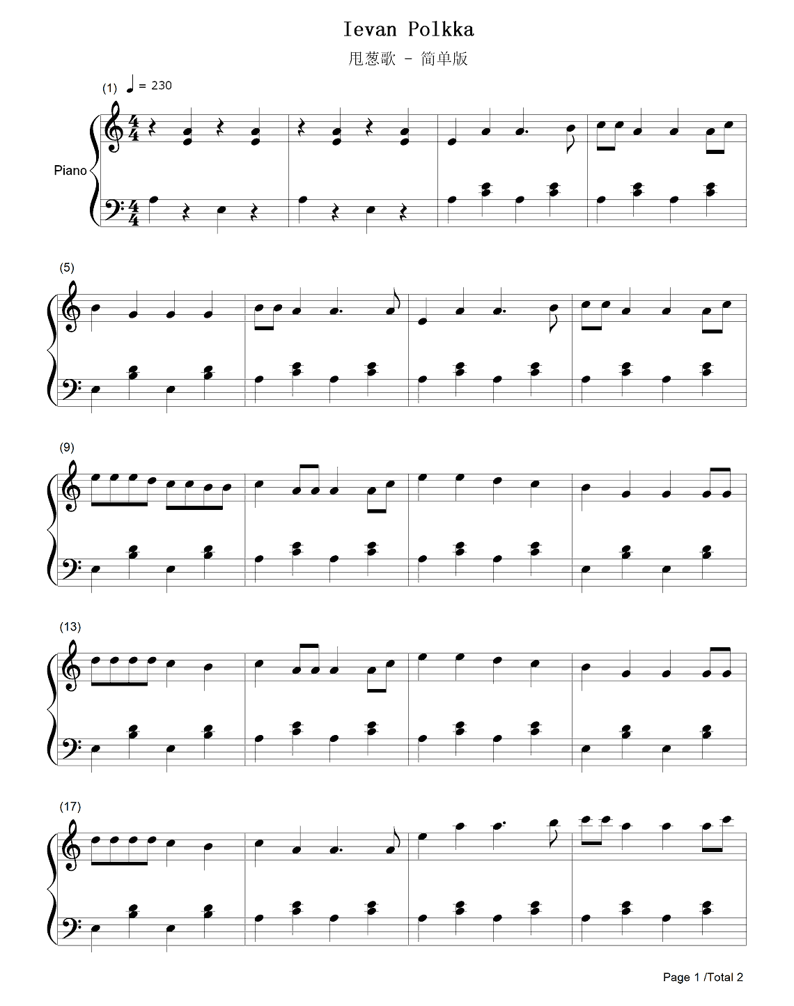 钢琴《甩葱歌》钢琴谱 简单版