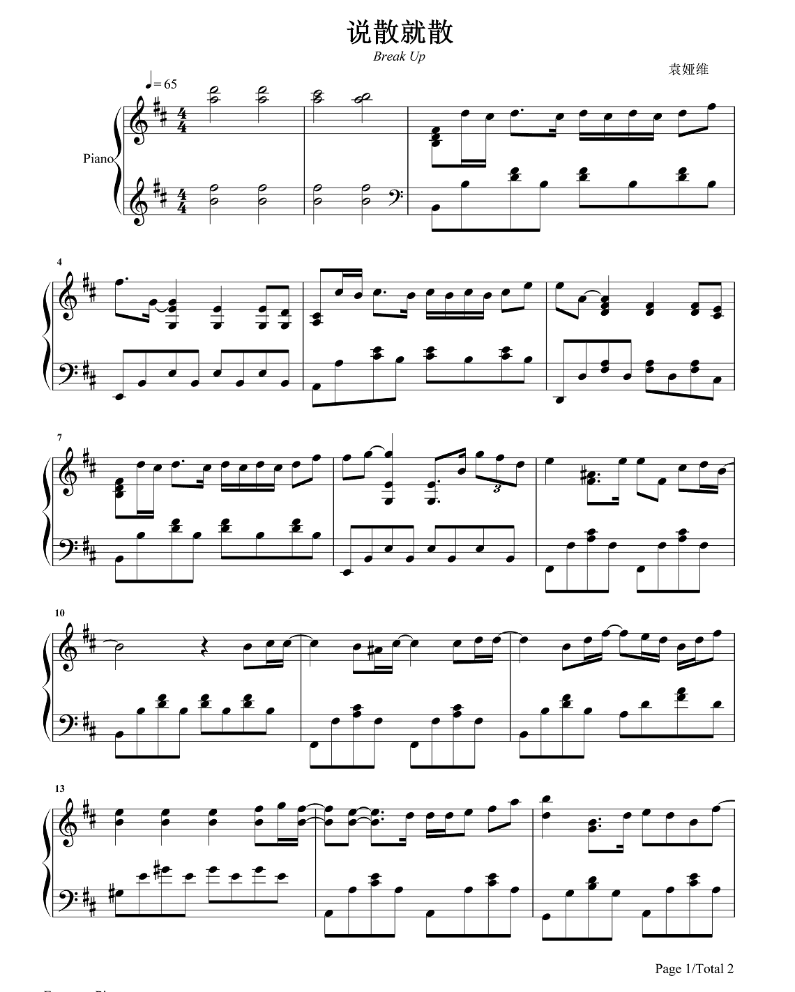 钢琴《前任3》主题曲《说散就散》钢琴谱