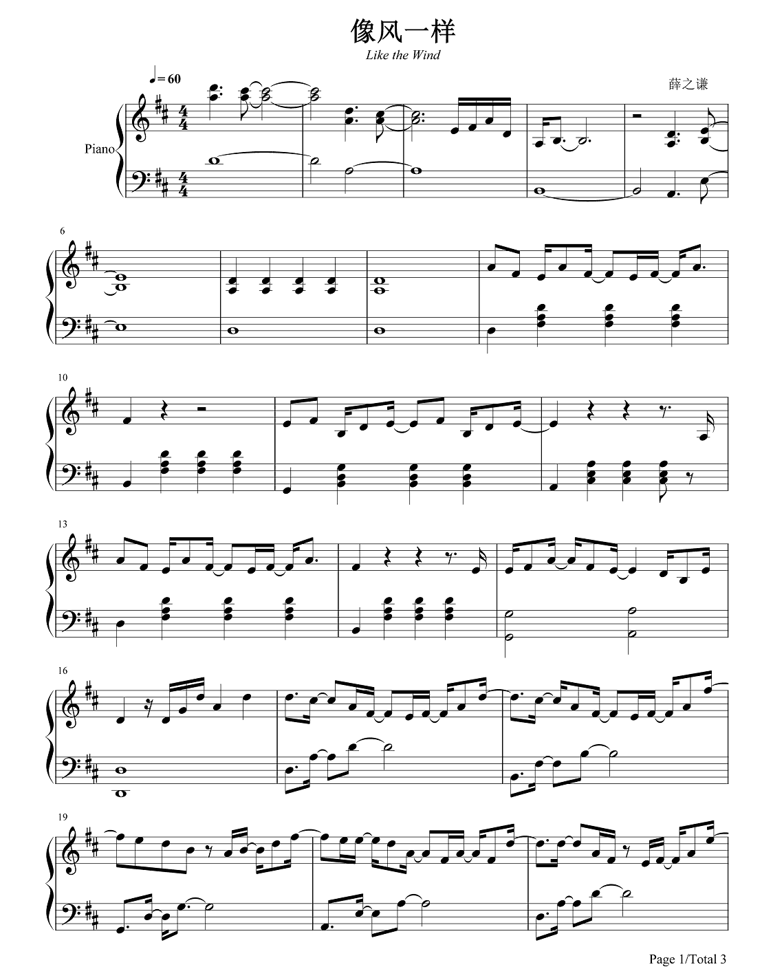 薛之谦《像风一样》钢琴谱...