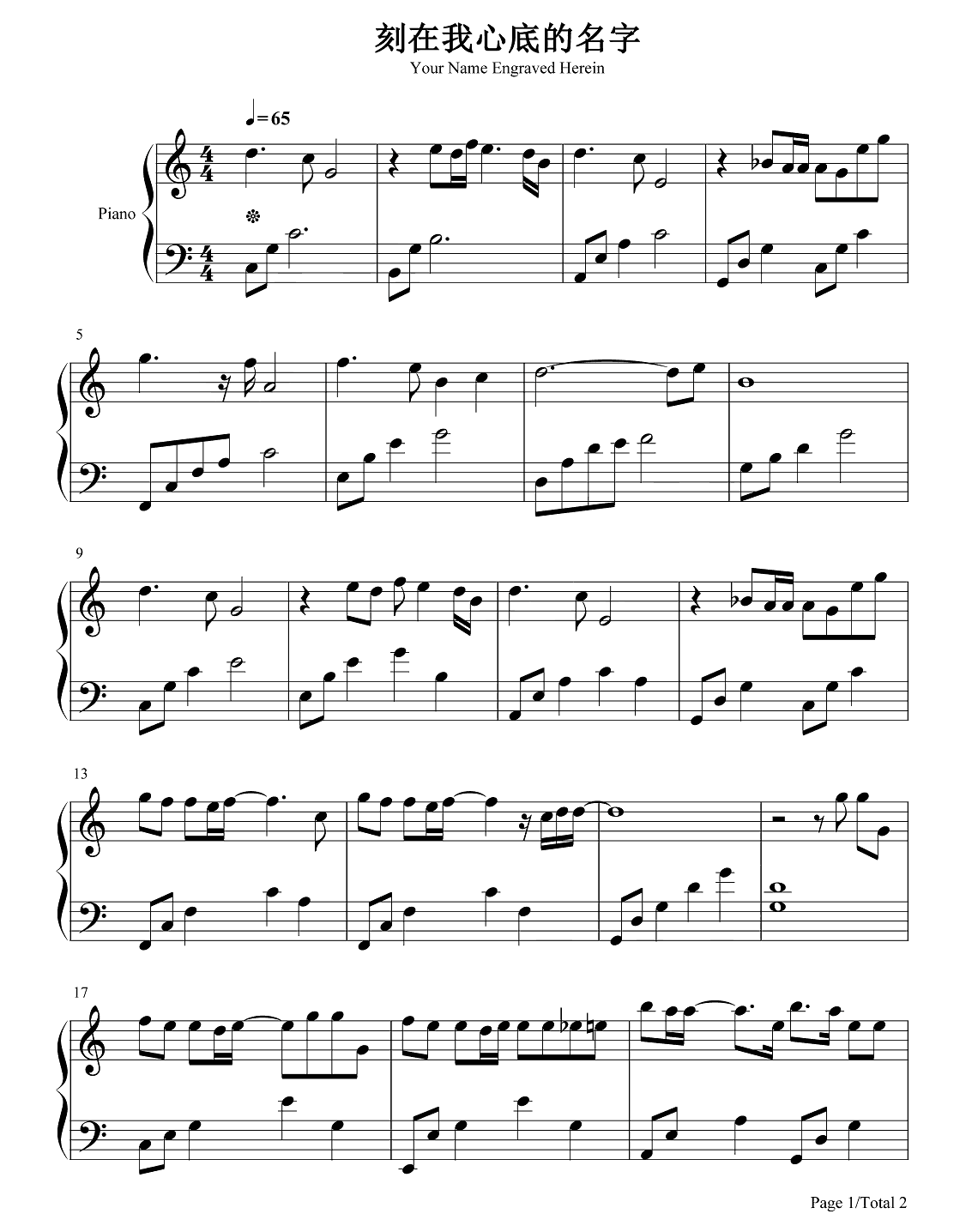 钢琴陈昊森《刻在我心底的名字》钢琴谱