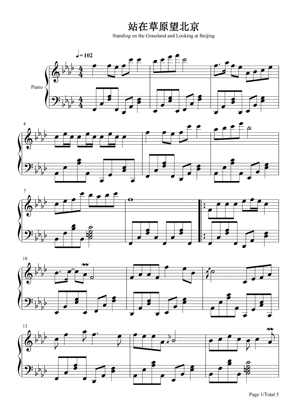 钢琴乌兰图雅《站在草原望北京》钢琴谱