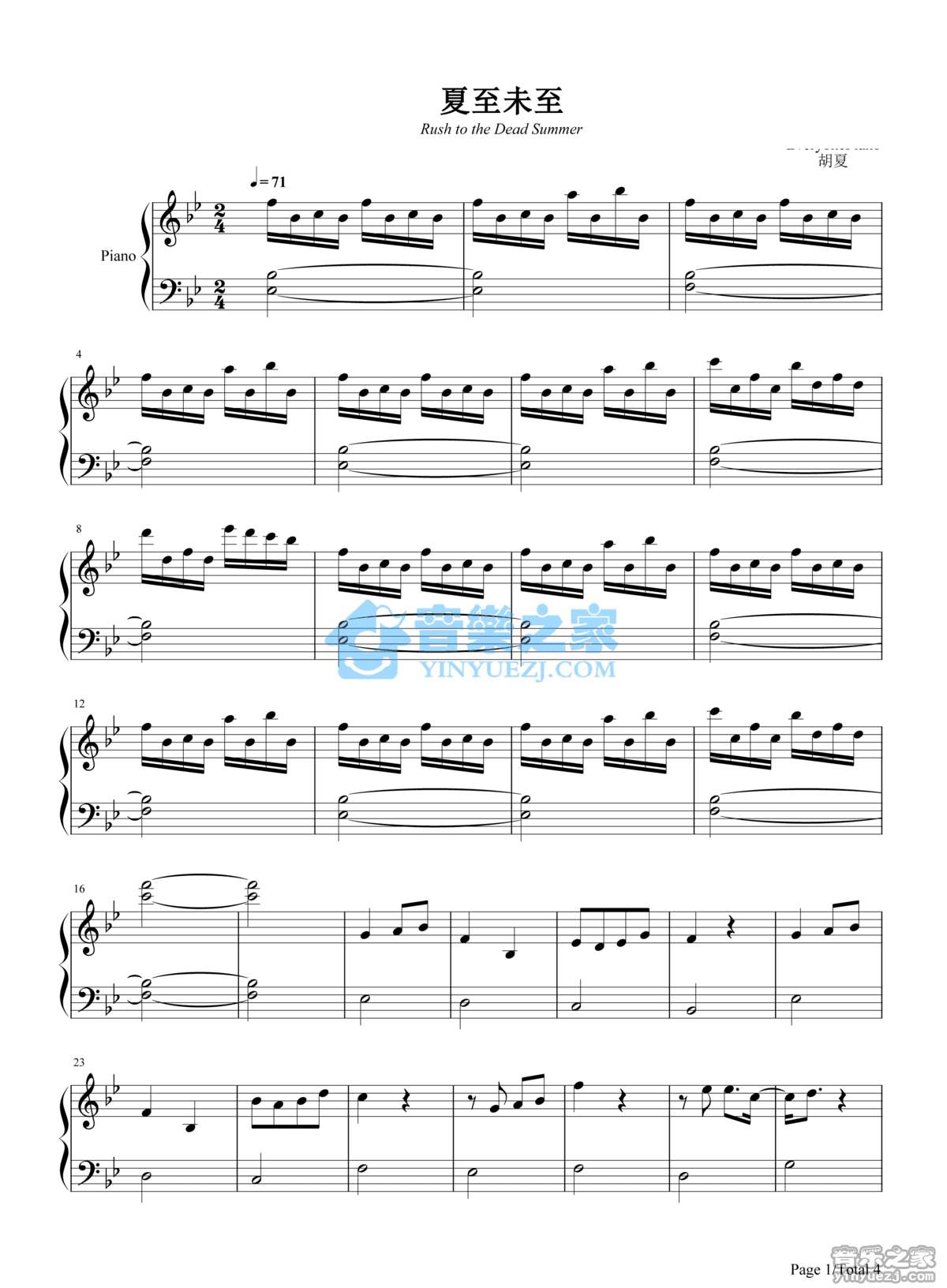 胡夏《夏至未至》钢琴五线谱...