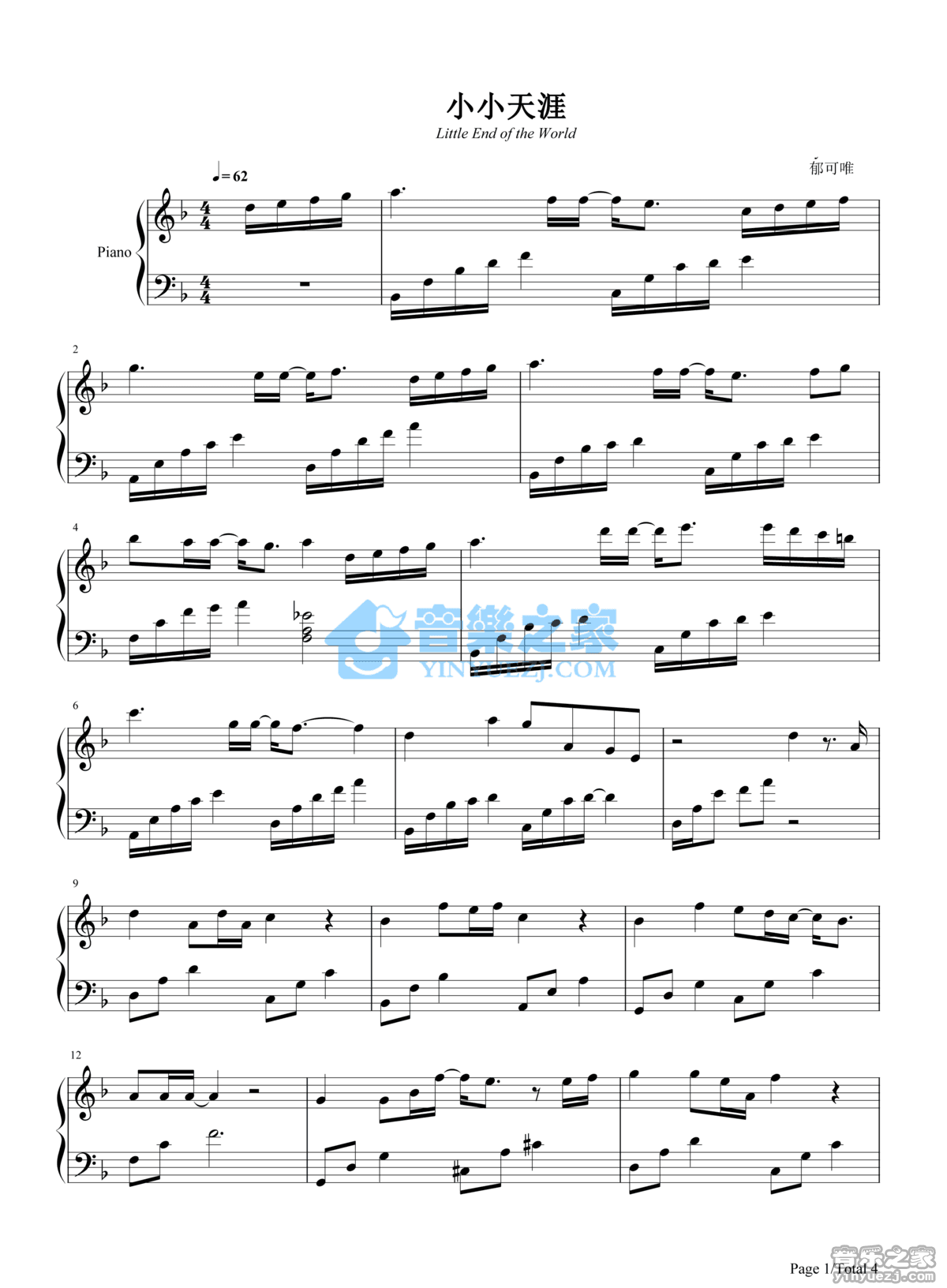 钢琴完整版 郁可唯《小小天涯》钢琴五线谱