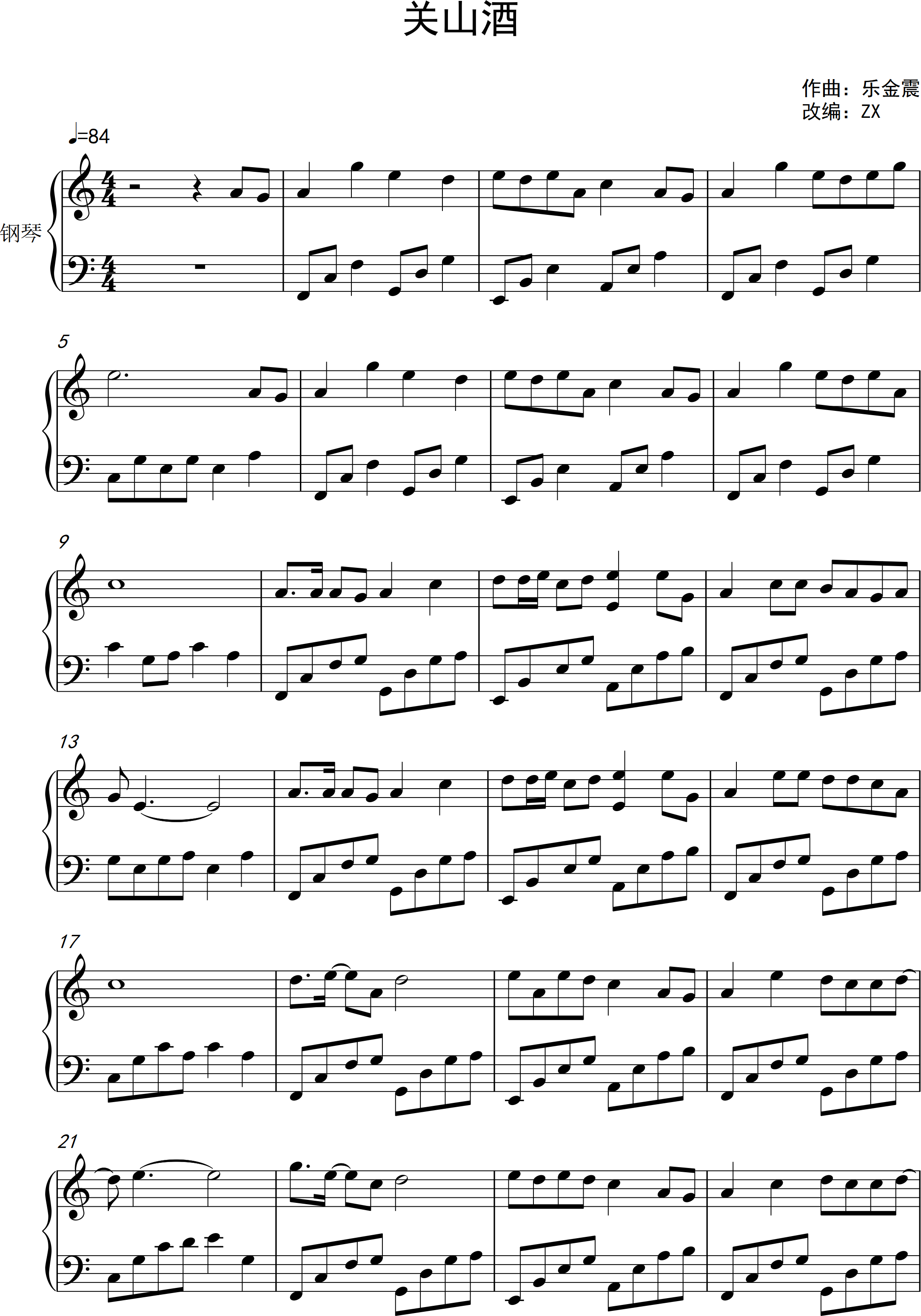 钢琴关山酒C调简单版抒情版