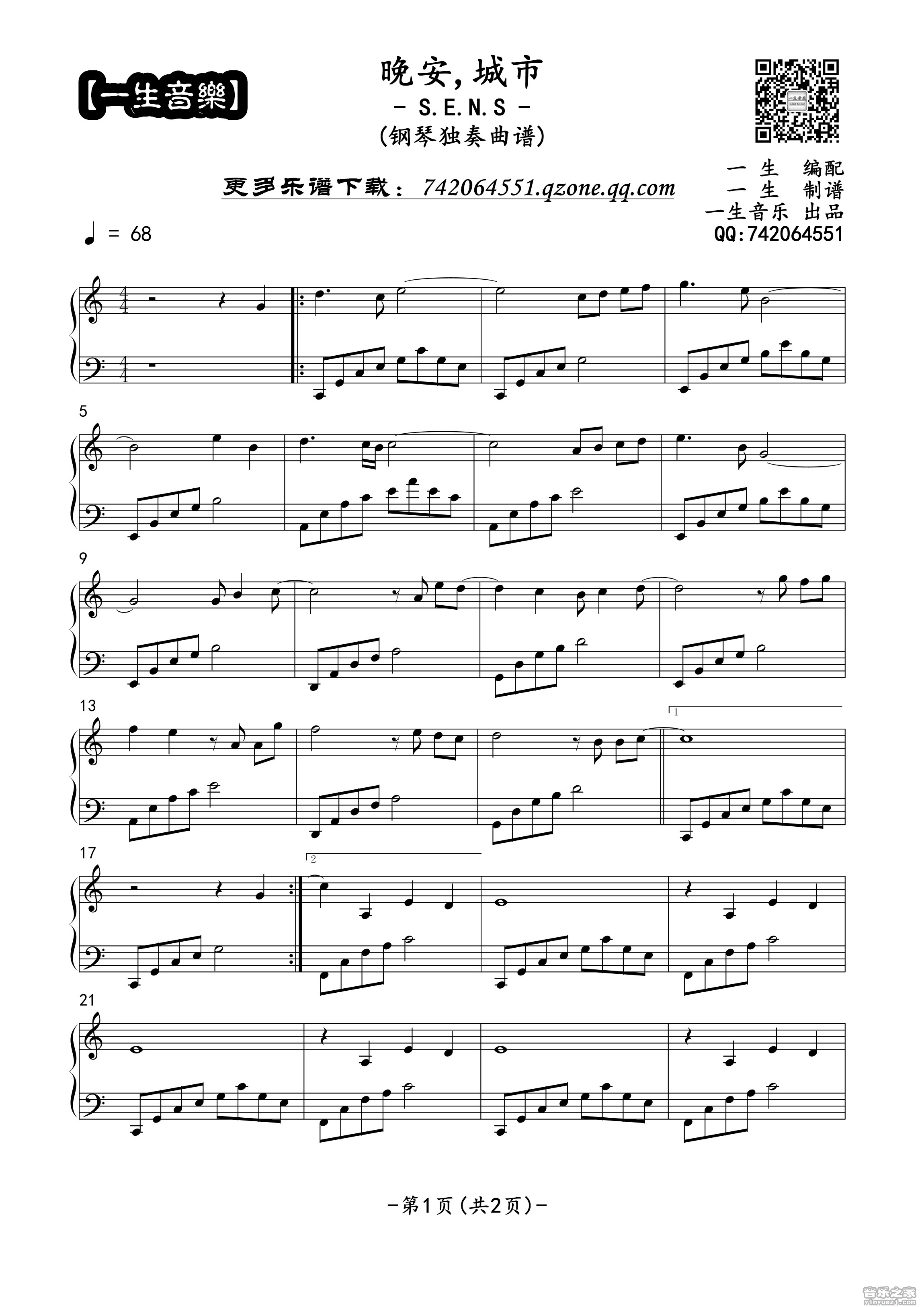 S.E.N.S《晚安,城市》钢琴五线弹唱谱...