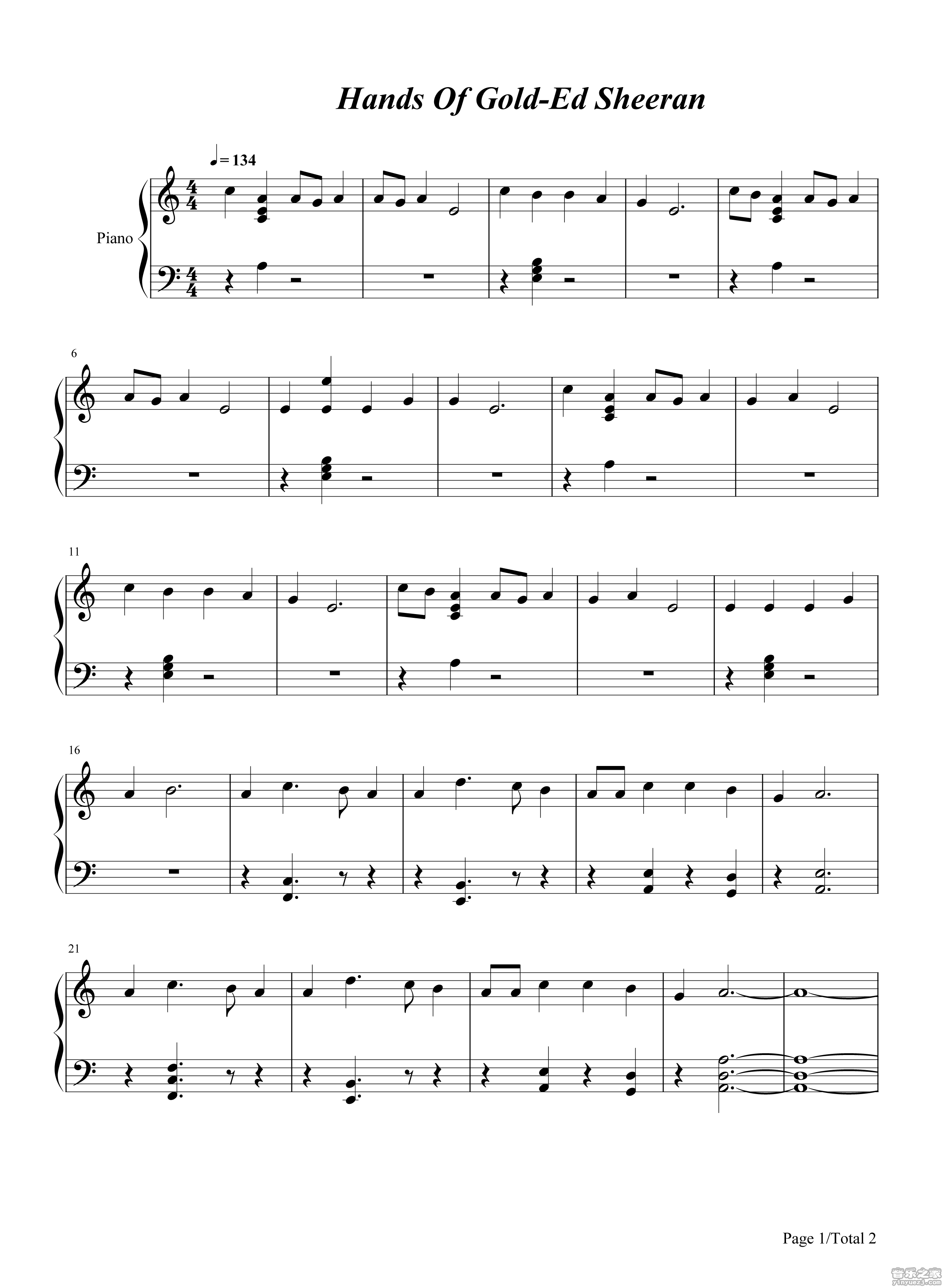 钢琴完整版 Ed Sheeran《Hands Of Gold》钢琴五线谱