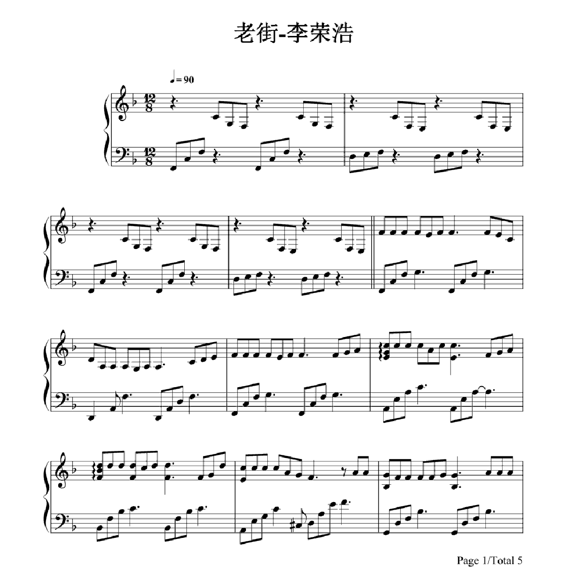 李荣浩《老街》钢琴谱,采用C调指法编配,共有5张高清图谱。...