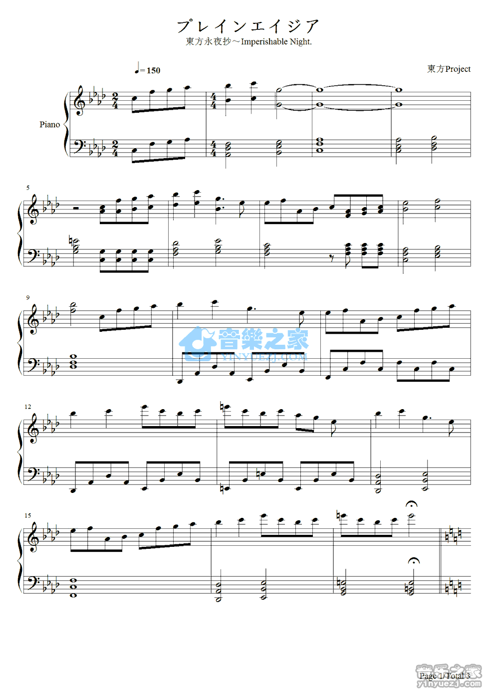 钢琴东方Project《プレインエイジア》钢琴五线谱