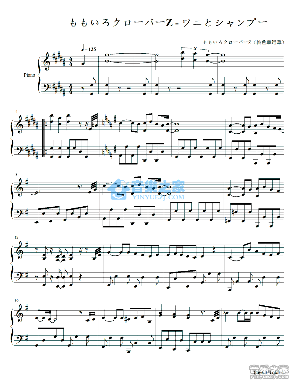 桃色幸运草Z《ワニとシャンプー》钢琴五线谱...