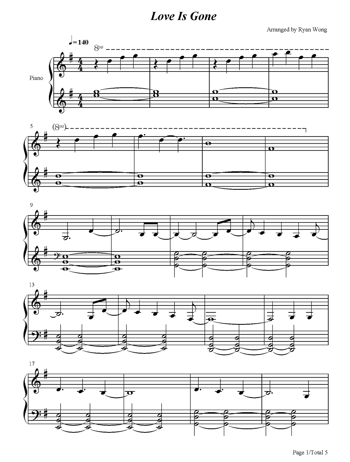 抖音热歌《LoveIsGone》钢琴谱,采用G调指法编配,共有5张高清图谱。...