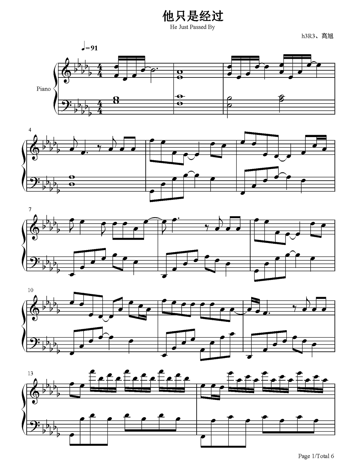 h3R3、高旭《他只是经过》钢琴谱,采用13调指法编配,共有6张高清图谱。...