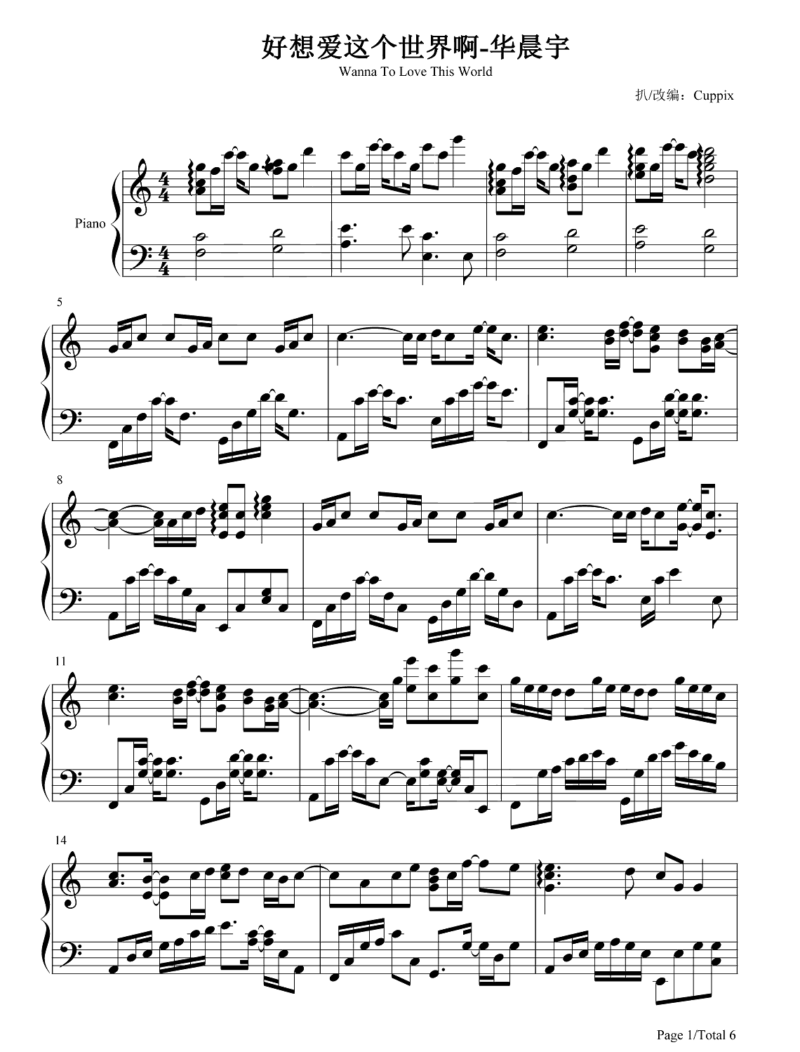 华晨宇《好想爱这个世界啊》钢琴谱,采用C调指法编配,共有6张高清图谱。...