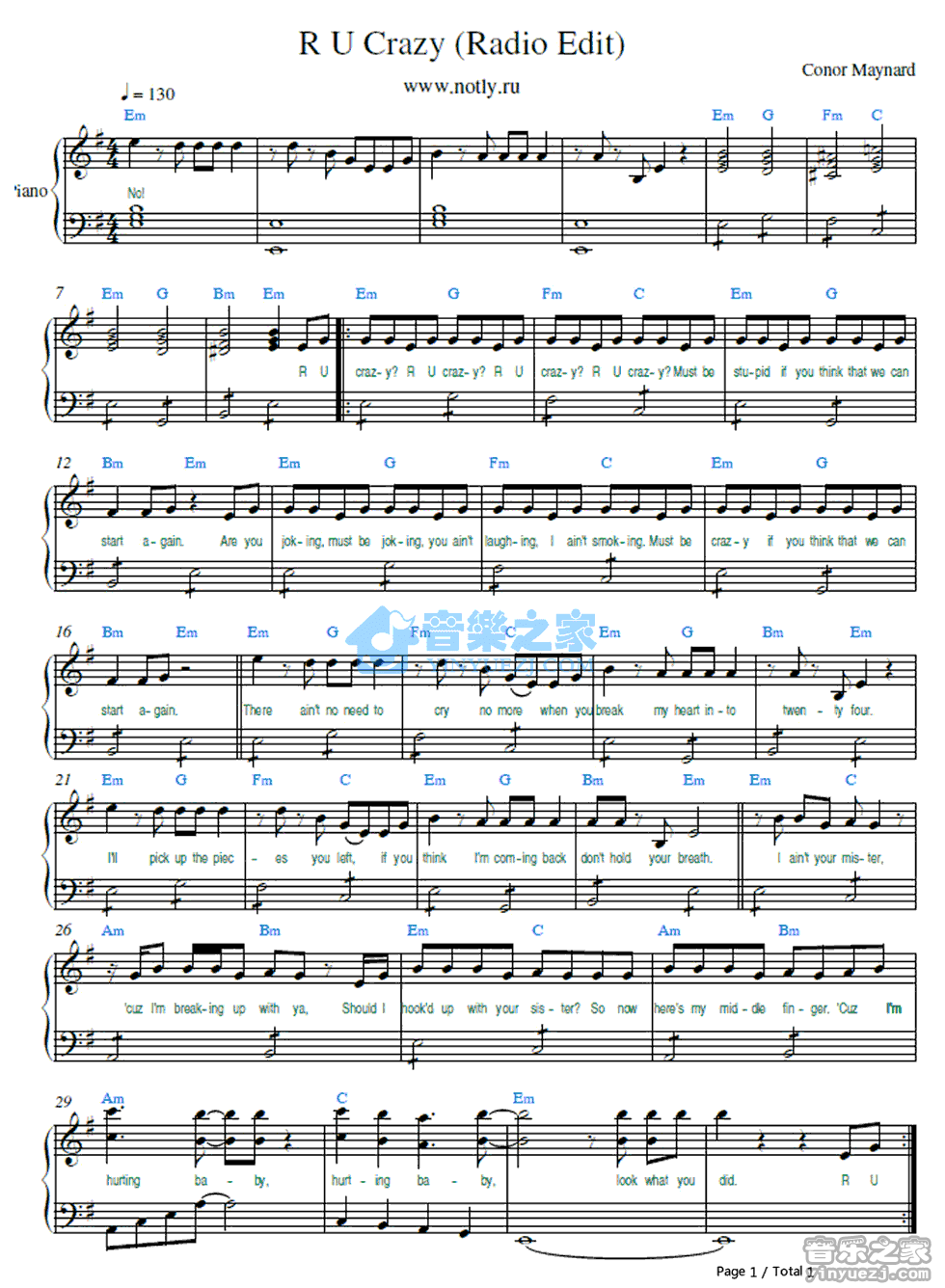 钢琴 Conor Maynard《R U Crazy》钢琴五线谱