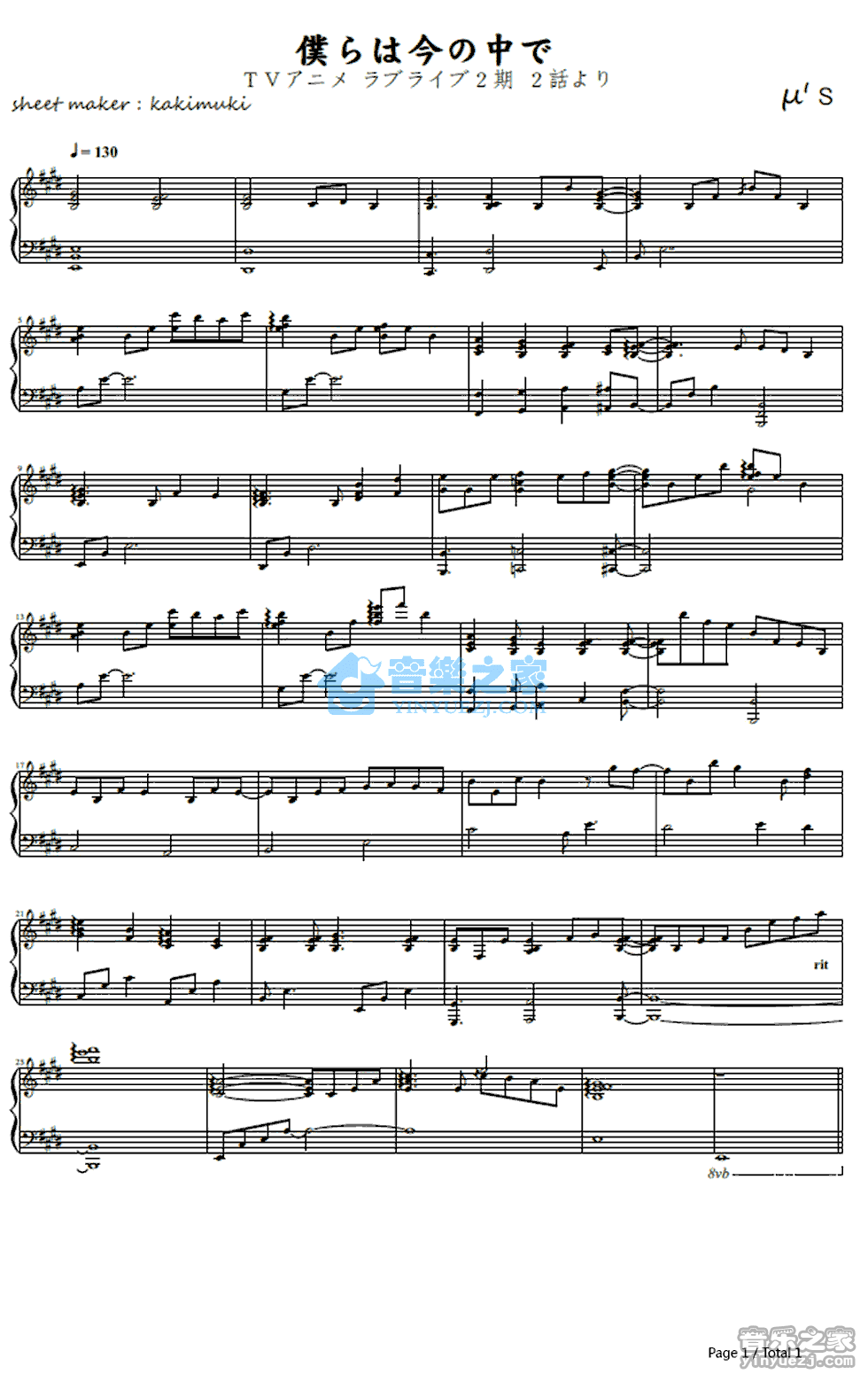 μ's《仆らは今のなかで》钢琴谱,采用E调指法编配,共有1张高清图谱,免翻页排版设计。...